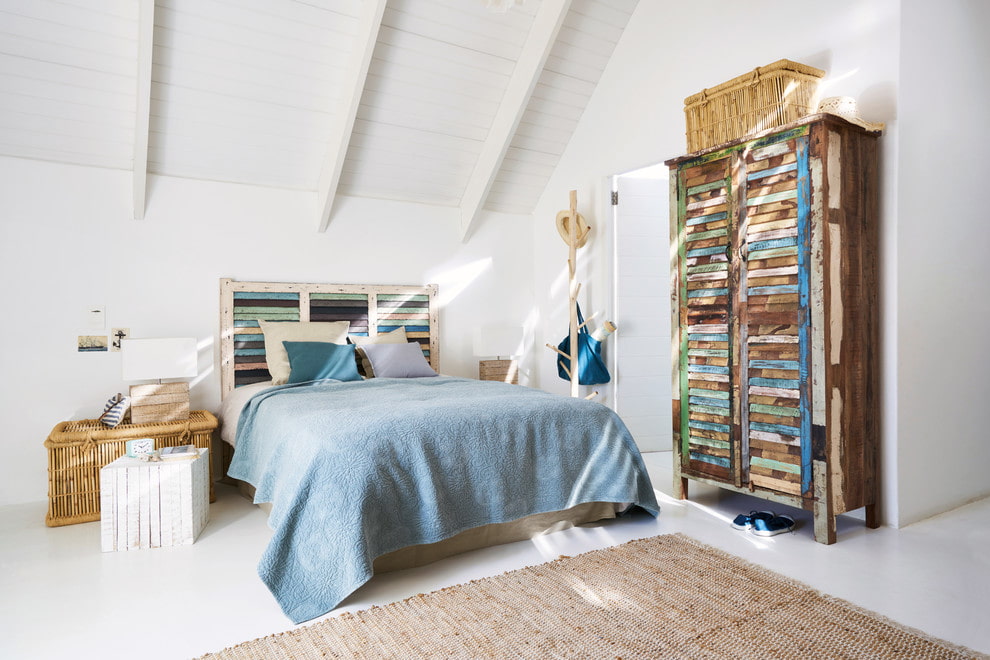 In the photo there is a creative attic in a nautical style with a purposely aged bed. It successfully echoes the wardrobe with its interesting colors.