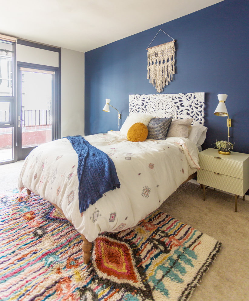In the photo there is a bed with a headboard painted the same color as the wall.