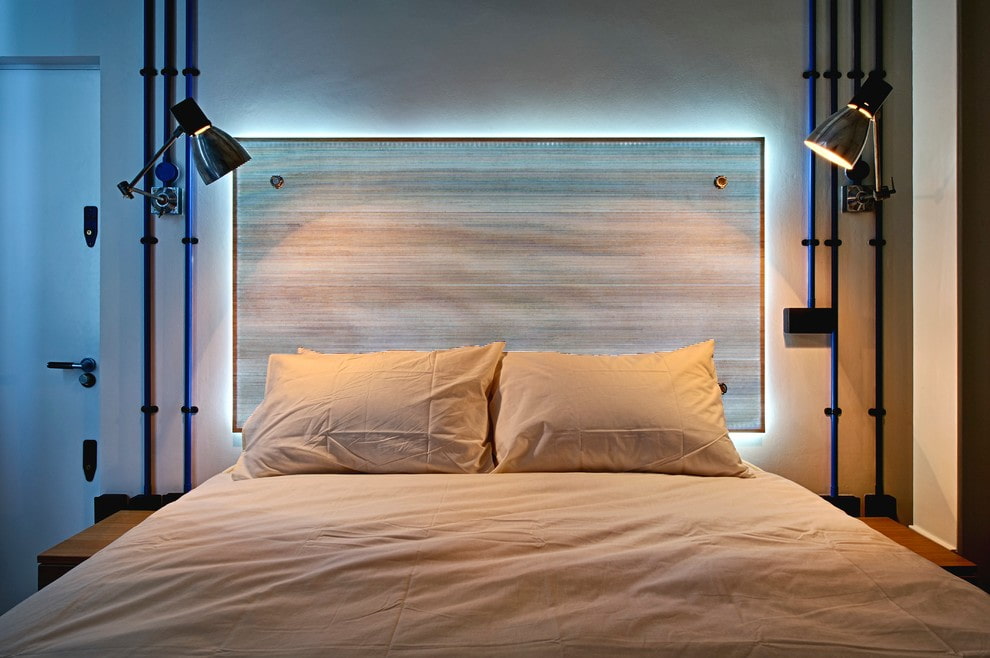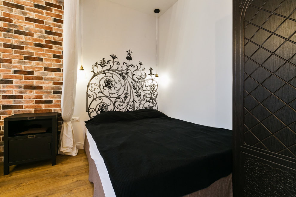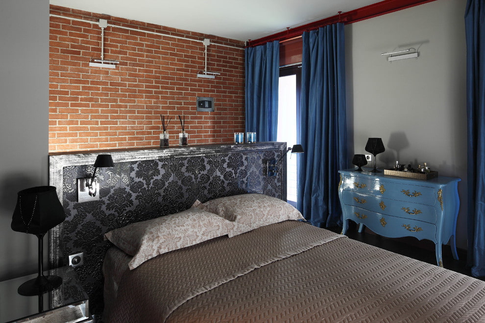 The photo shows a soft headboard. Its plain fabric without colors and traditional patterns does not stand out from the general concept of industrial style.