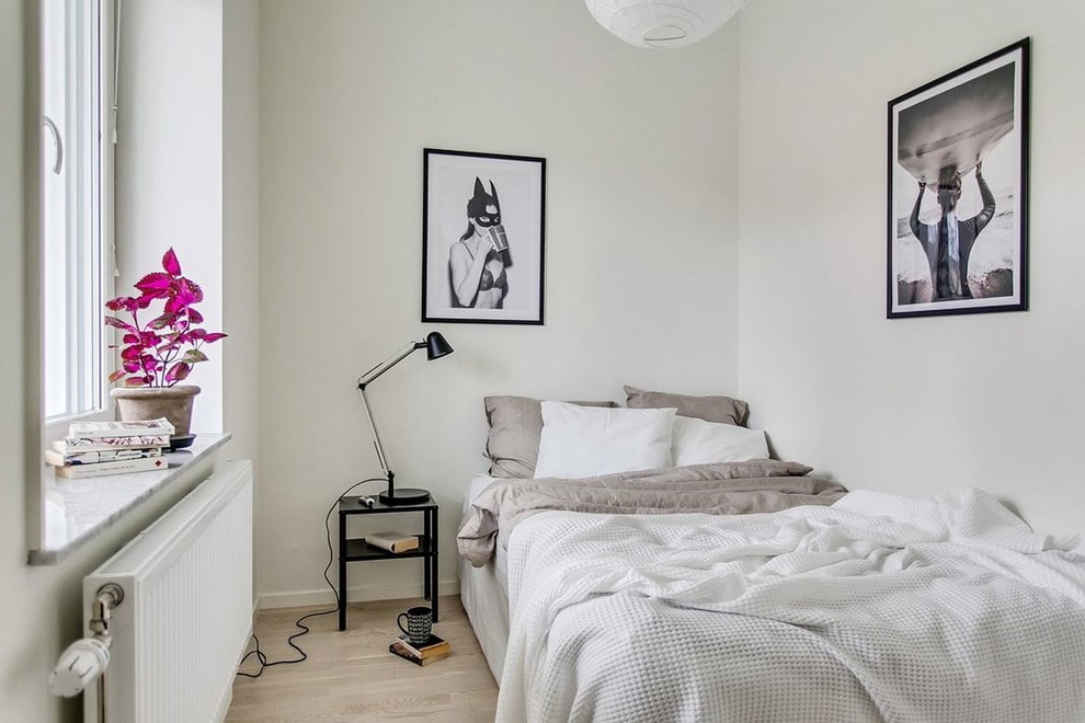 If your small space is rectangular, it will be easier for you to arrange pieces of furniture and define zones. The bed is placed along a long wall, leaving passages on the sides. To save space, push the bed into the corner, you can approach it only from one side, but a work or make-up table will fit in the bedroom. When the door and window are on short walls opposite each other, you can install the headboard to the window. Then there will be space for the cabinet near the door.