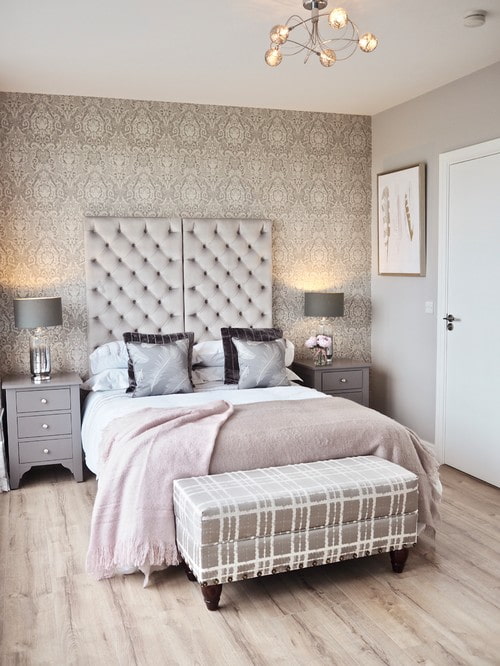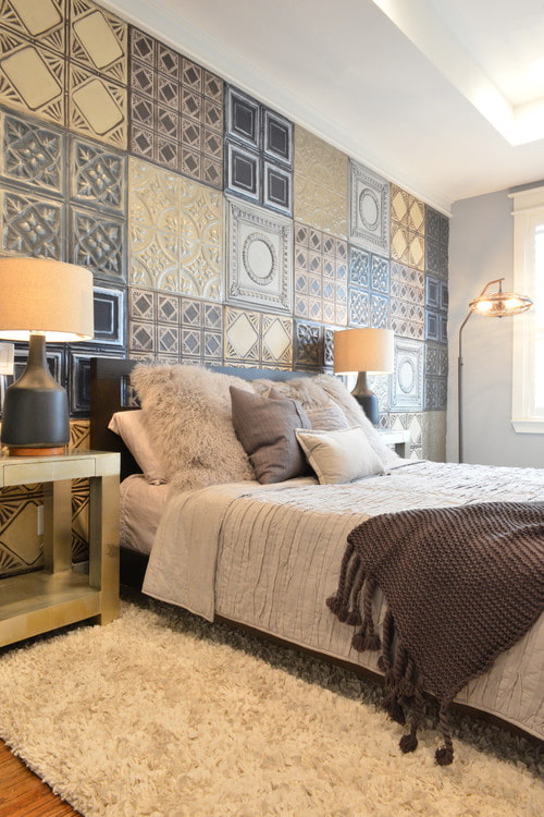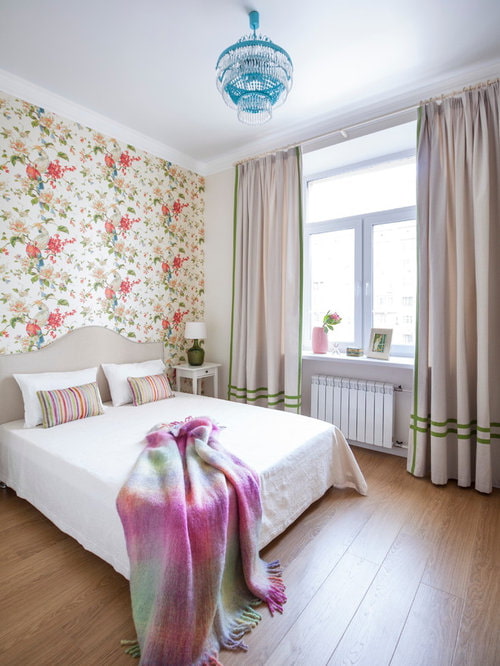 Walls. Classic solutions - wallpaper, paint, decorative plaster. The laminate behind the headboard looks unusual. Use wall decoration to correct the geometry of the room: dark, narrow walls in an elongated room will visually balance it. On the long side, panoramic wallpaper or simple wallpaper with a pattern is glued.