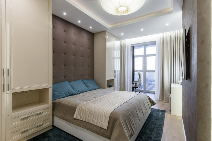 Rectangular bedroom with an area of 15 m2. The layout of a 3 by 5 room should be built starting from the window. Most often it is located on the short side opposite the door, then the bed is installed across the long one in the center. Thus, the window will have space for the working area, and at the door for the wardrobe.
