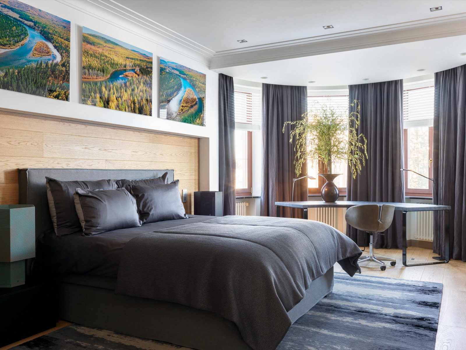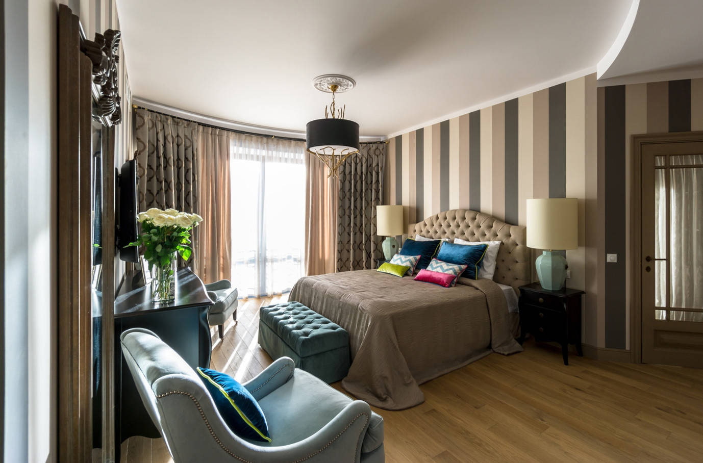 The palette for interior decoration is selected in accordance with the preferences of the bedroom owners.A spacious room does not need a visual expansion of the space, so the walls can be both dark and light. Whites, beige and grays are the most popular colors - they provide a neutral backdrop for any bright accents. Restrained olive, dusty pink and complex blue shades set you up for relaxation, do not excite the nervous system and do not bore you for a long time.