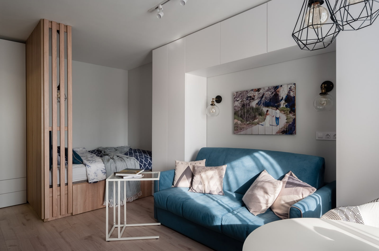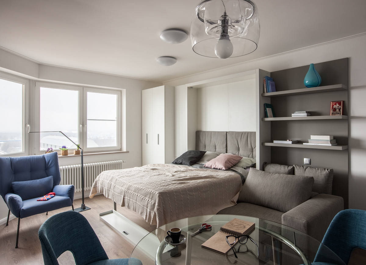 If it is supposed to equip the living room in the room, it is necessary to zone the sleeping place and the area for receiving guests. The sofa can be positioned behind a partition, shelving or tall wardrobe. An increasingly common solution is transforming furniture, when the bed rises up and turns into a part of the wall or a sofa.