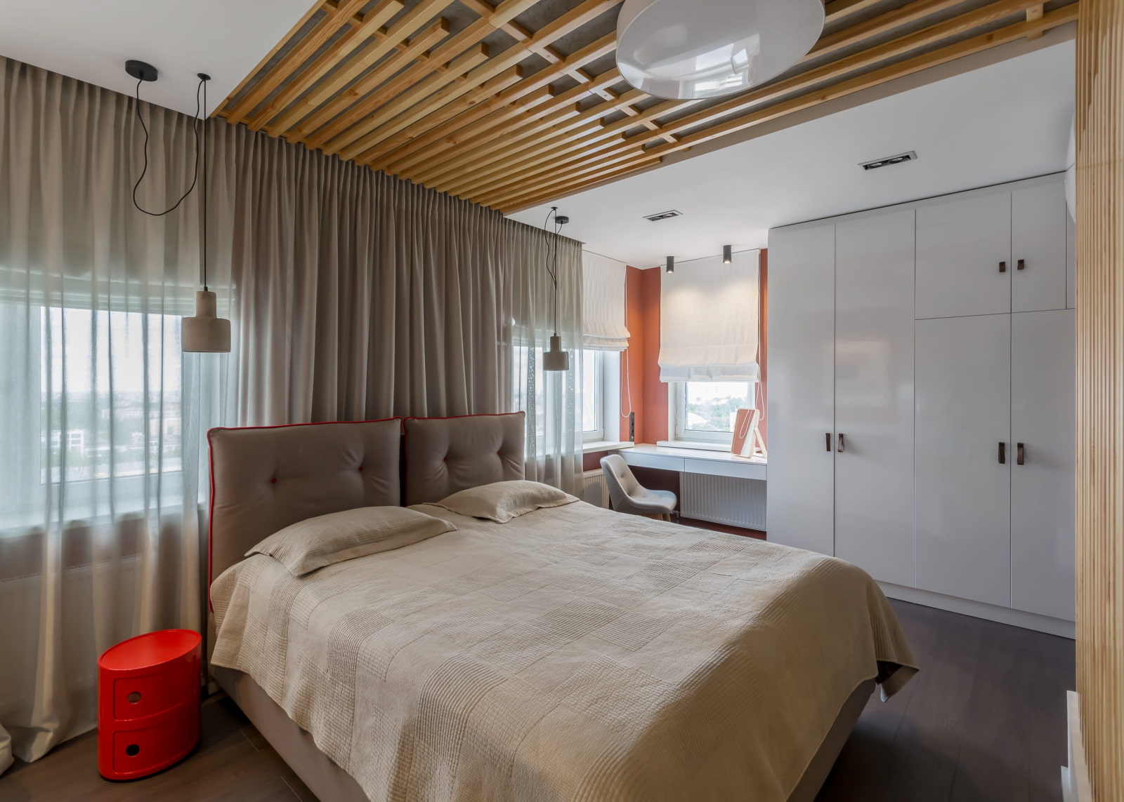 Storage systems, dressers and wardrobes are usually placed opposite or to the side of the berth: a comfortable distance must be maintained between them. The free space can be filled with an armchair, ottoman or dressing table.