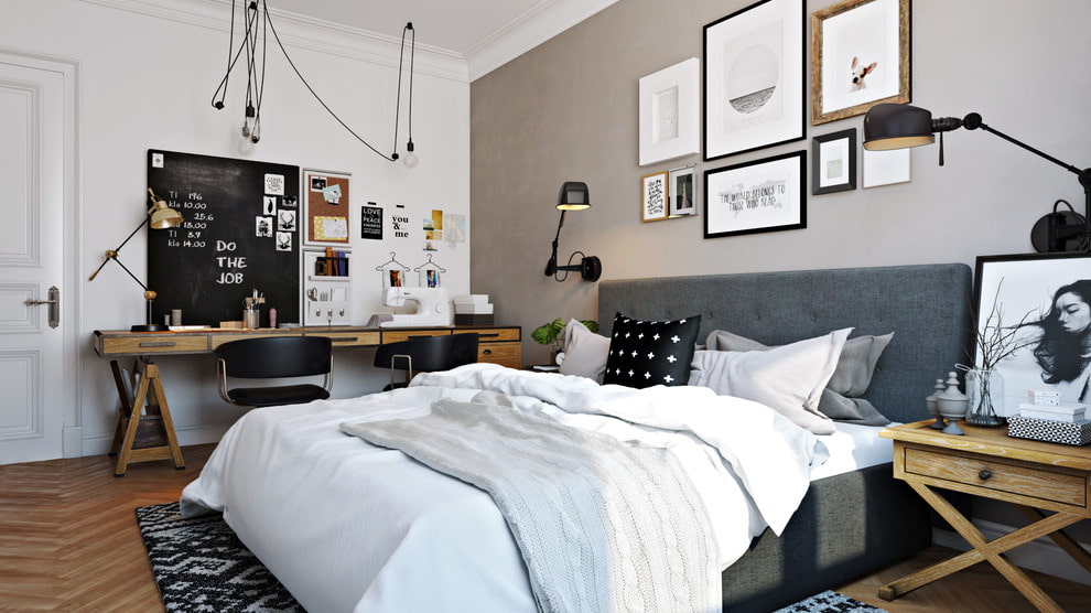 In the photo there is a Scandinavian-style bedroom with a soft double bed and an original designed workplace.