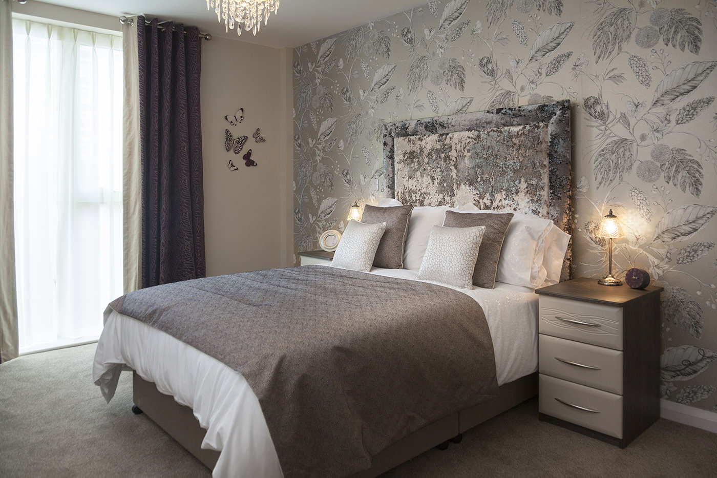 Photo 2. White floral patterns on gray wallpaper create a calm backdrop, while the deep purple color of the headboard adds depth and expression to the interior.