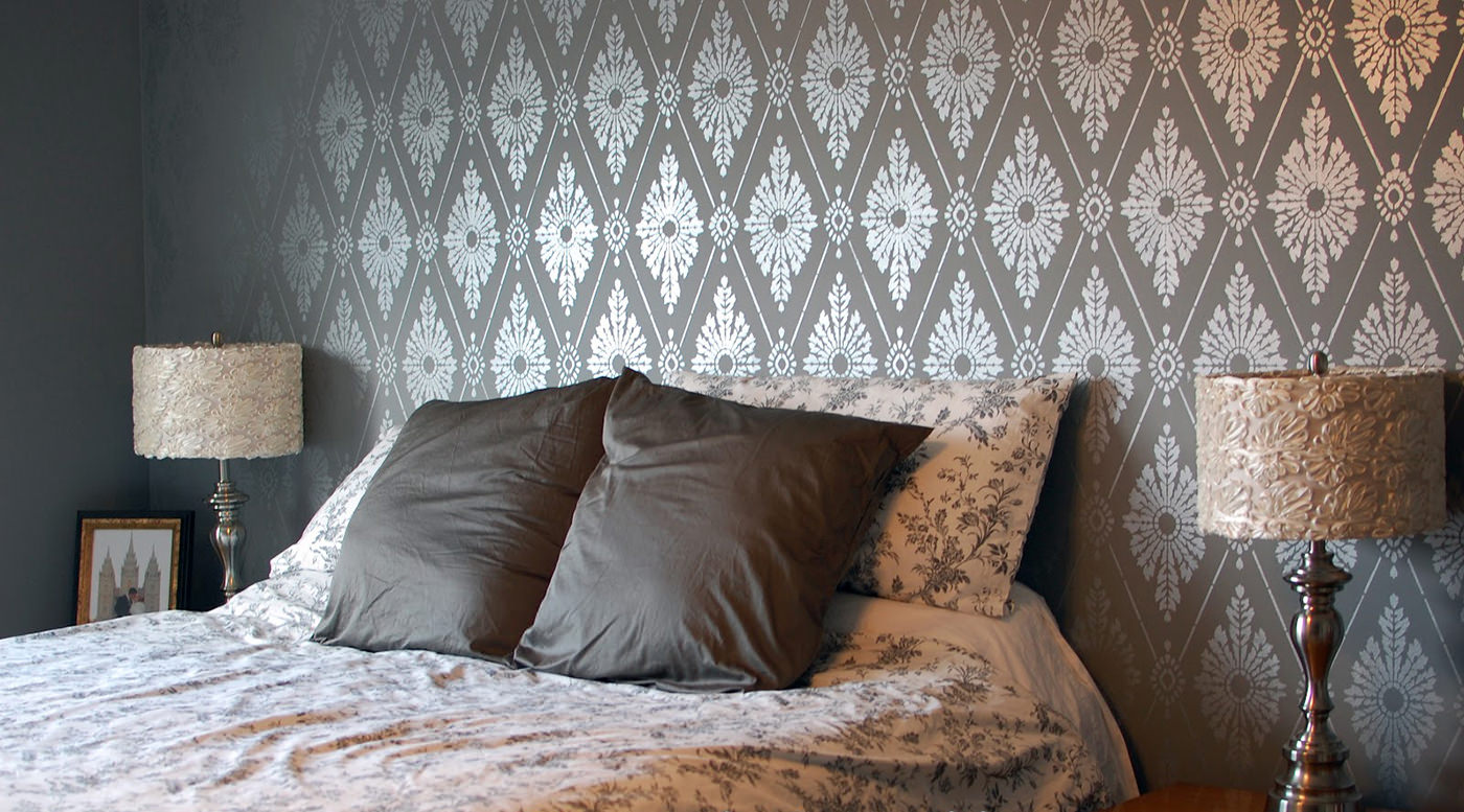 Photo 1. Gray wallpaper with a dark monogram pattern is perfect for a classic bedroom.