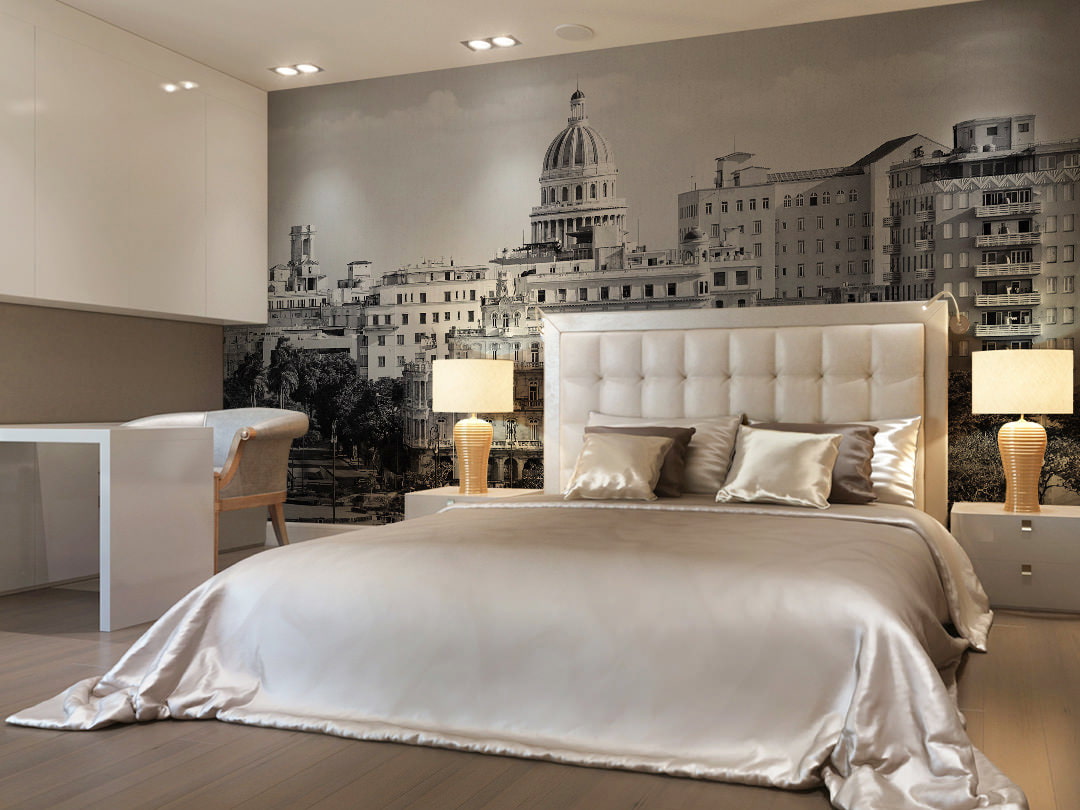 - Wall murals in gray tones can visually reduce the size of the bedroom;
