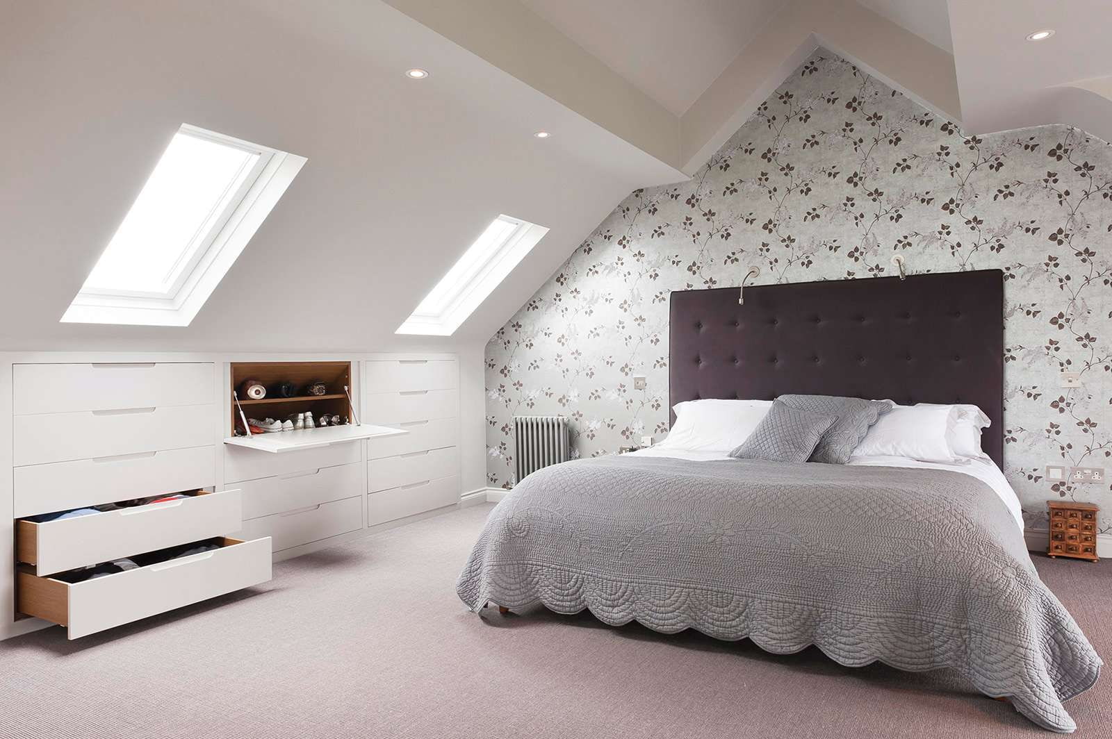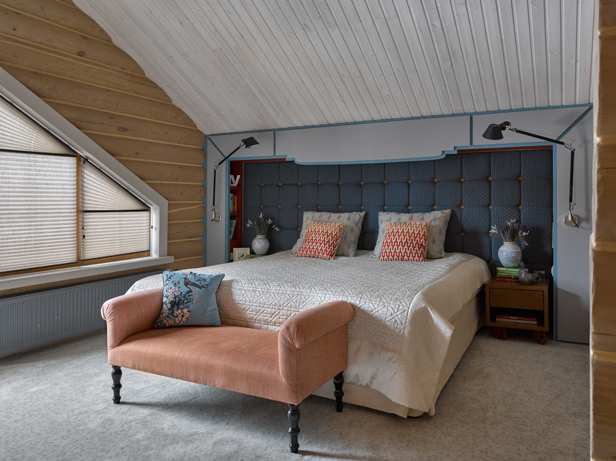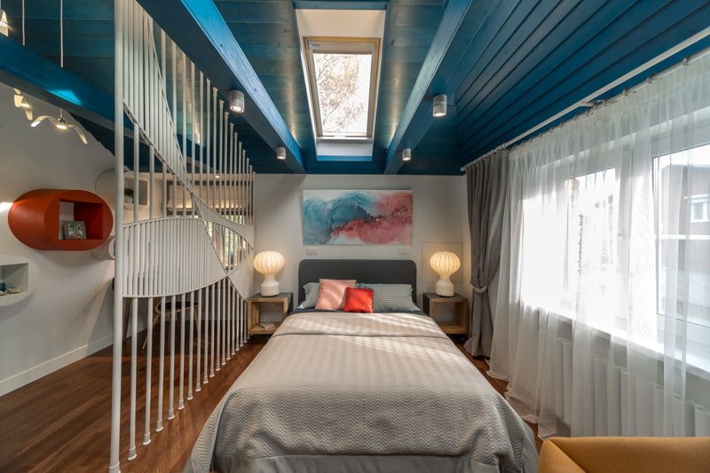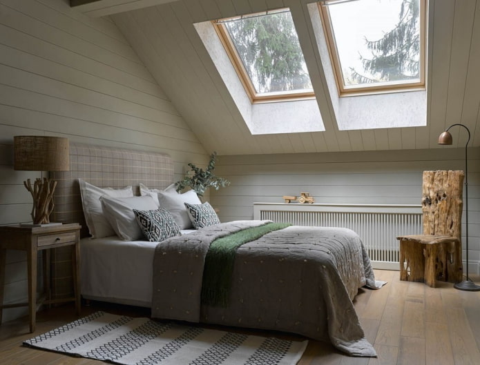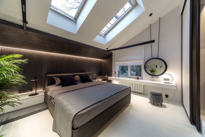 The second location option is an insulated attic. For its unusual shape, many owners of country houses fell in love with it. Sloping or slanting ceilings look stylish and allow you to create an interesting interior. In addition, the attic area allows you to place a bathroom or study next to the bedroom. Another plus of this layout is the saving of floor space.