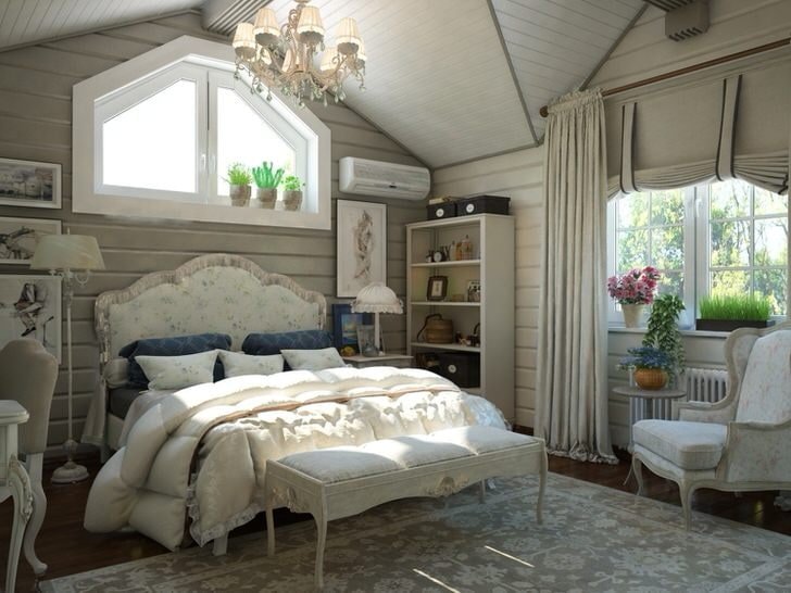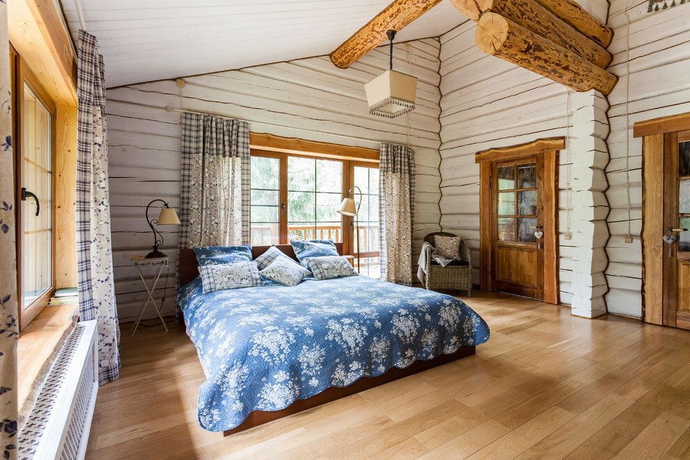 If you have to renovate a wooden house, emphasize the naturalness of the materials using techniques from the country or Provence style. Perfectly combined with wood and white Scandinavian design, which will look especially good in a bedroom with windows to the north.