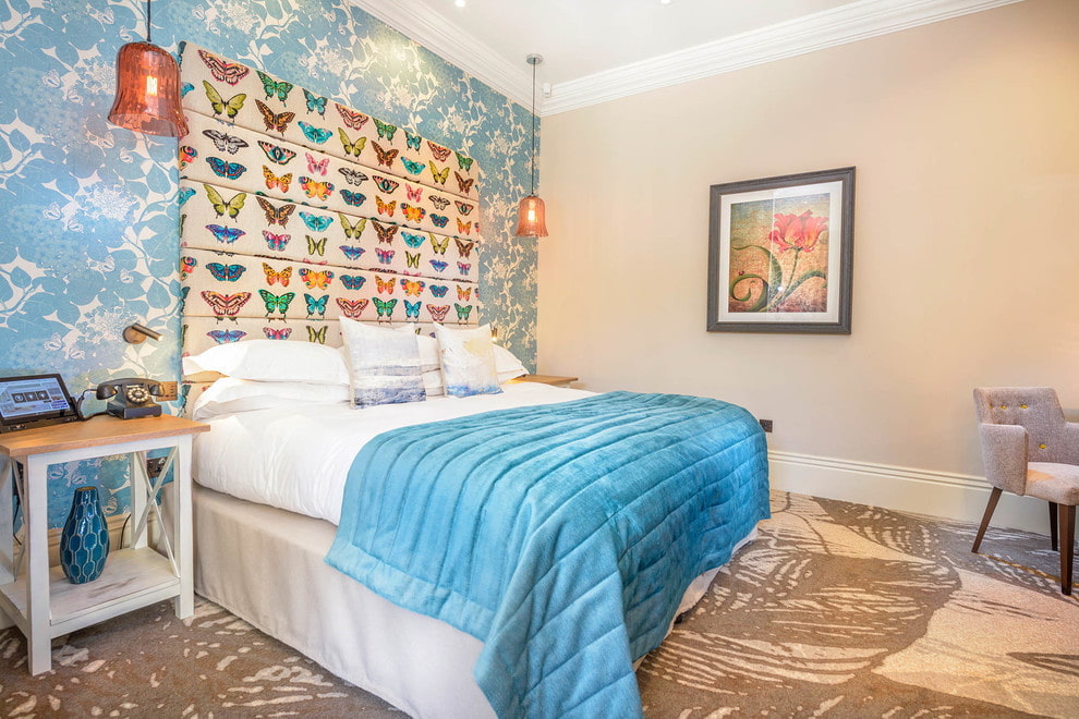 - Walls. Blue wallpaper with azure, turquoise notes or floral motifs will help to form the illusion of freshness and cleanliness in the bedroom. Thanks to the sky background, the patterns on the walls look more expressive and rich. In creating an accent plane, you can use canvases with monograms, curls or Gzhel ornaments.