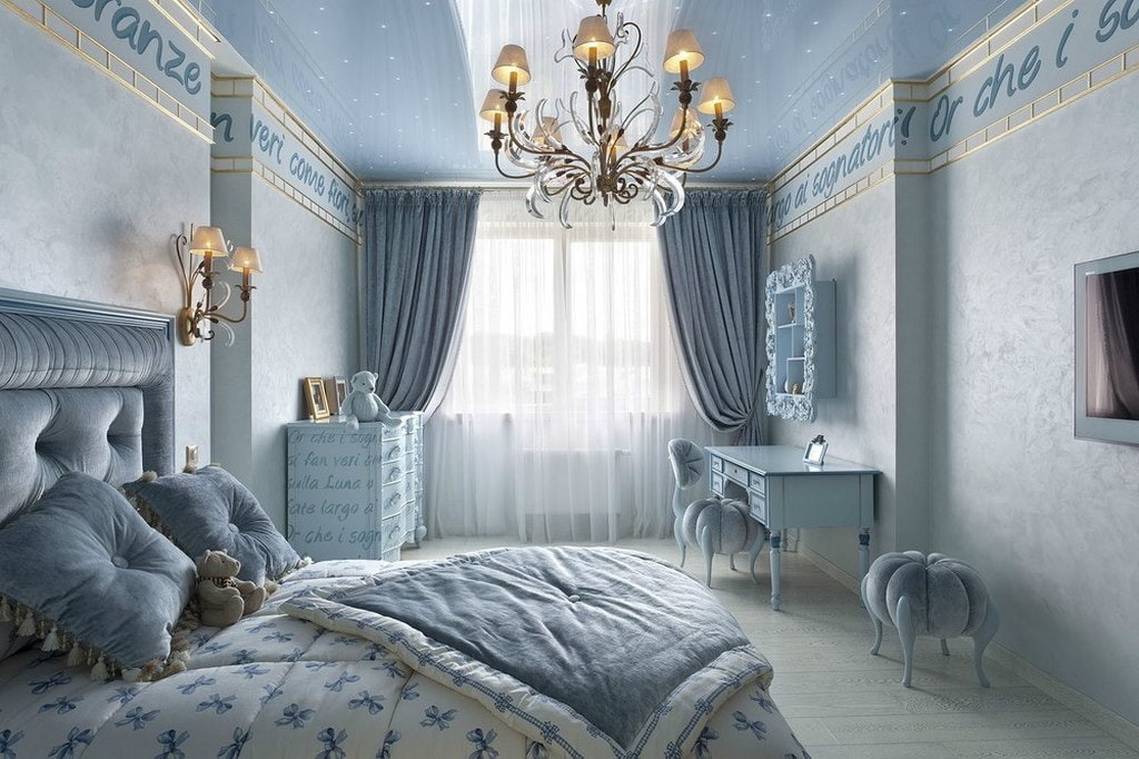 As curtains, it is appropriate to use fabrics with various textures, which, depending on the lighting, can change color. For a luxurious and rich atmosphere, the window in the blue bedroom is decorated with canvases with lambrequins or lush draperies, matching in tone with the canopy above the bed. To create a calm and laconic design, choose straight curtains on eyelets or snow-white tulle curtains.
