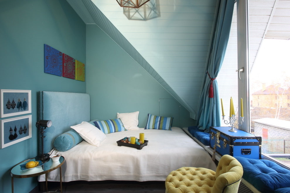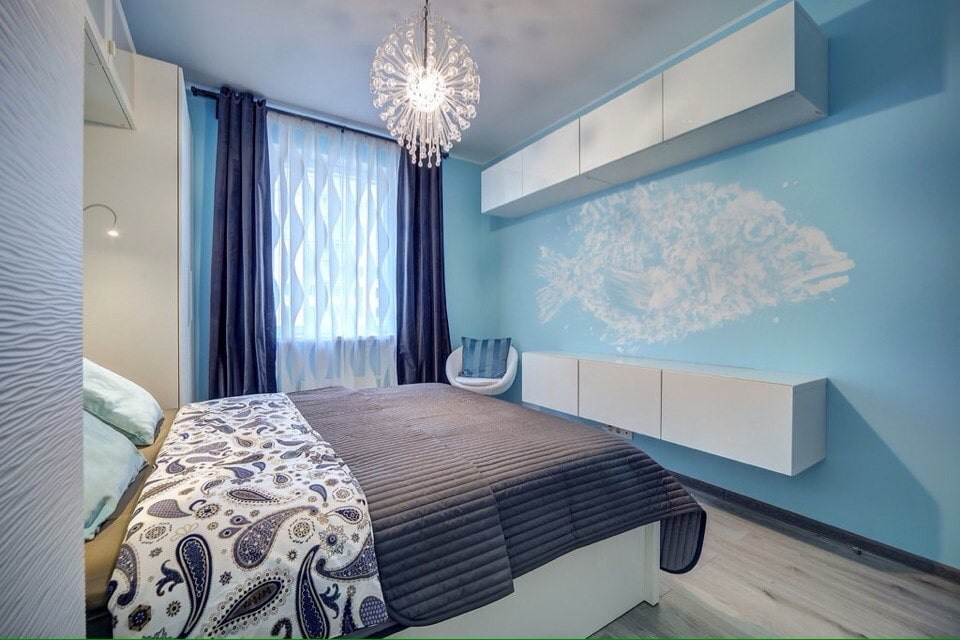 The sky blue palette in the room looks clean and transparent, but despite its attractiveness, it is quite cold and requires thoughtful and careful use.