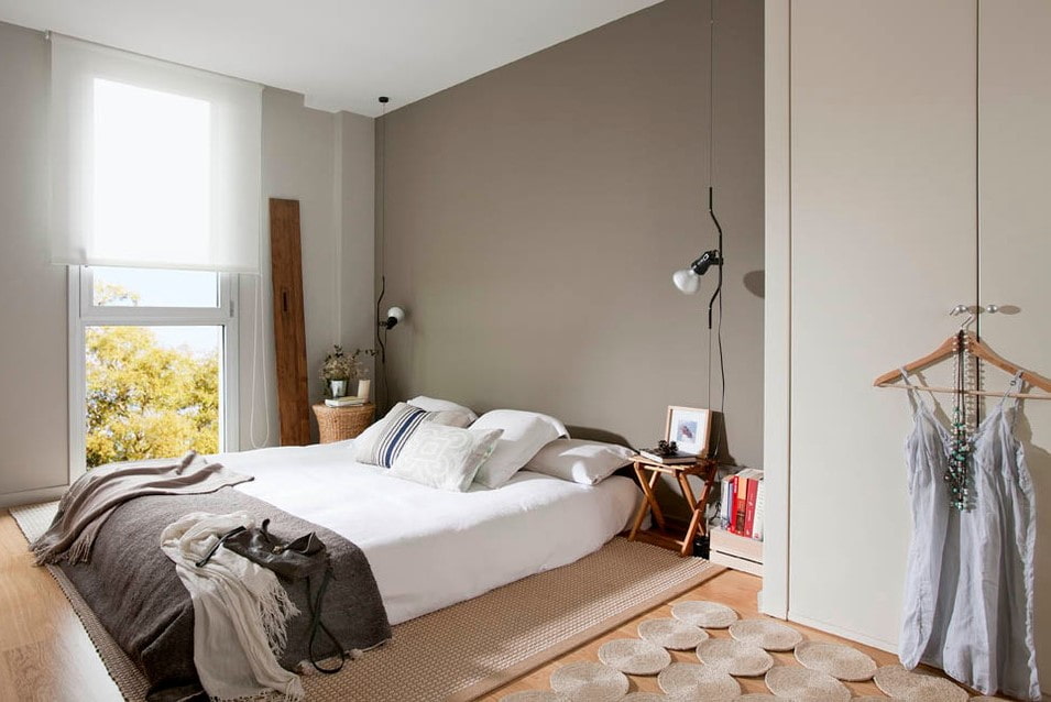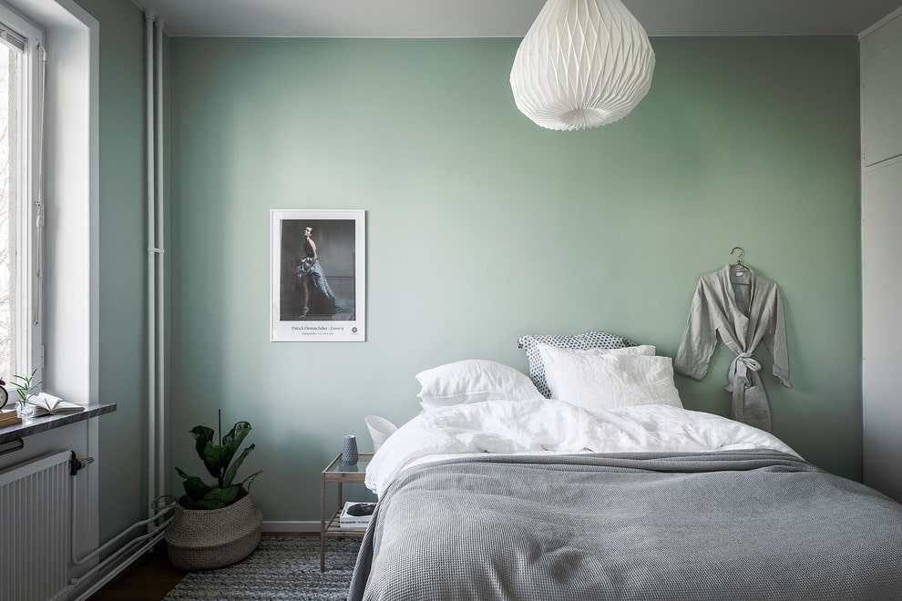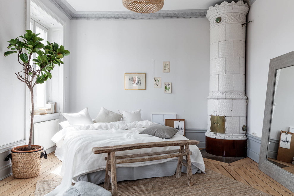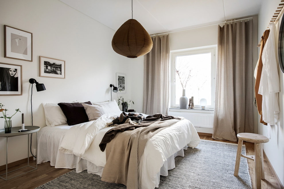 The Scandinavian-style bedroom uses a minimum amount of furniture items that do not overload and do not take up free space. For example, a wardrobe can be replaced with an open hanger, and bedside tables with small tables, shelves, or stools.