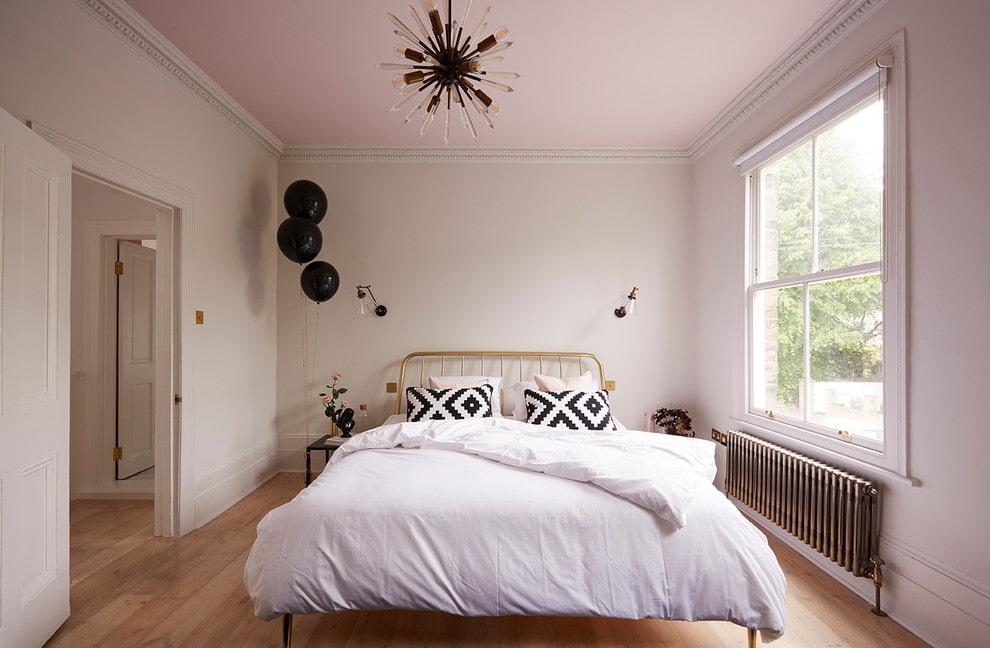 Basically, the surface of the ceiling is simply painted in a boiling white color. Some interiors allow for a light gray finish. A more modern solution is a stretch or suspended plasterboard structure with a velvety matte effect.
