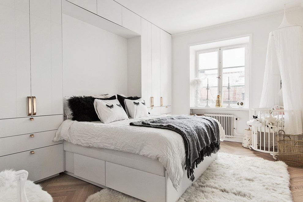 In the photo there is white furniture in the interior of a bedroom in a Scandinavian style.