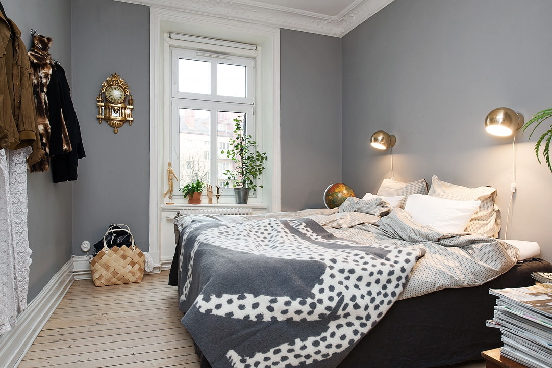 Pictured is a small gray Scandinavian-style bedroom.