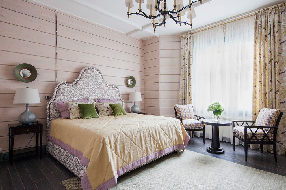 Light pink interior warms the bedroom and does not look intrusive. Wallpaper with a floral or plant print looks good.