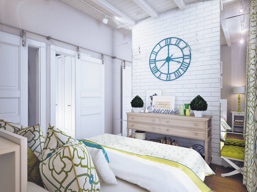 The brick wall in the bedroom can be painted in the same tone as the rest of the walls, or in a contrasting one, in this case becoming the central point in the interior, from which all the rest of the decorative design will be built.