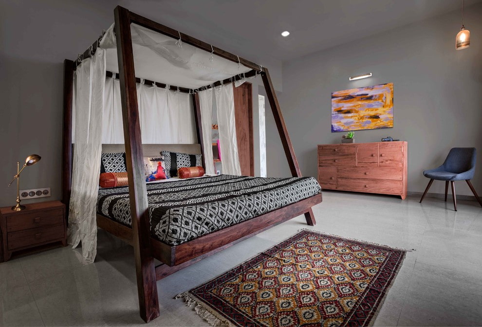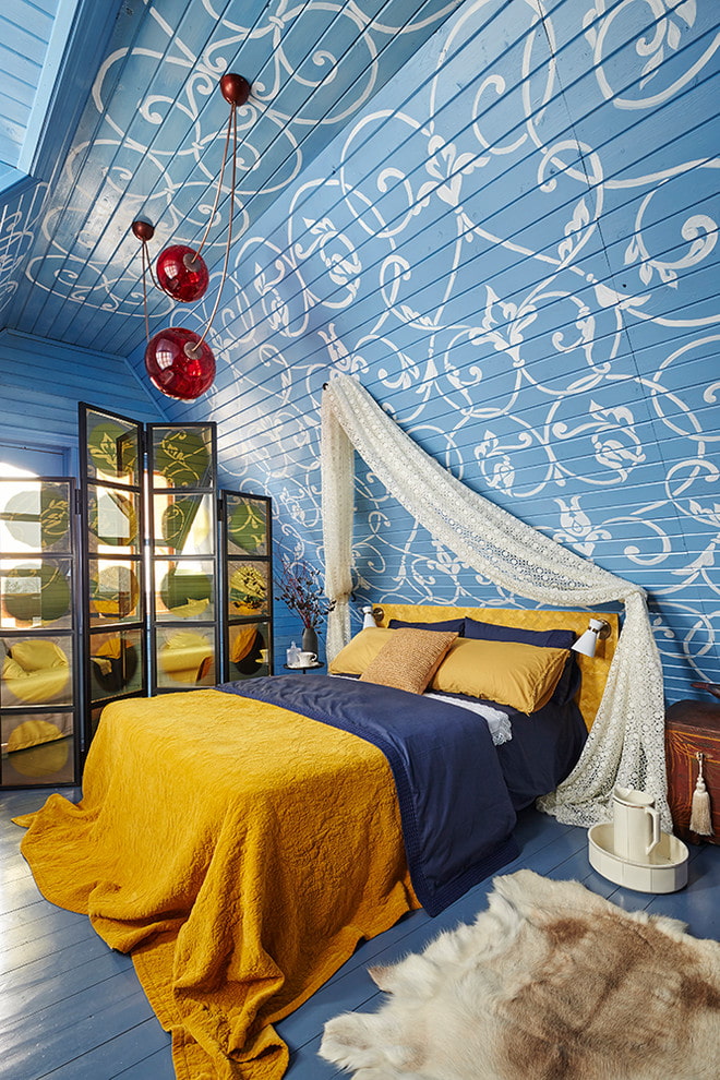 The photo shows an unusual solid wood ceiling structure that ties together the ceiling and the bedroom decor.