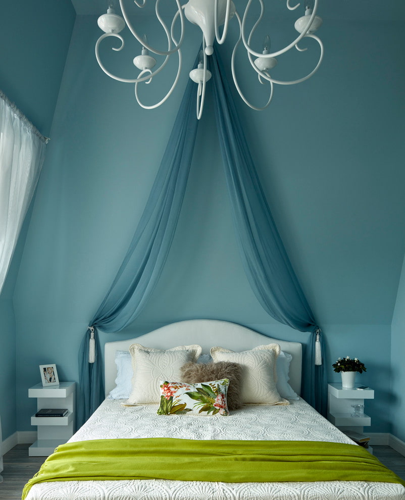 In the photo there is a spacious attic in blue tones. A graceful canopy visually softens the rough beamed ceiling.