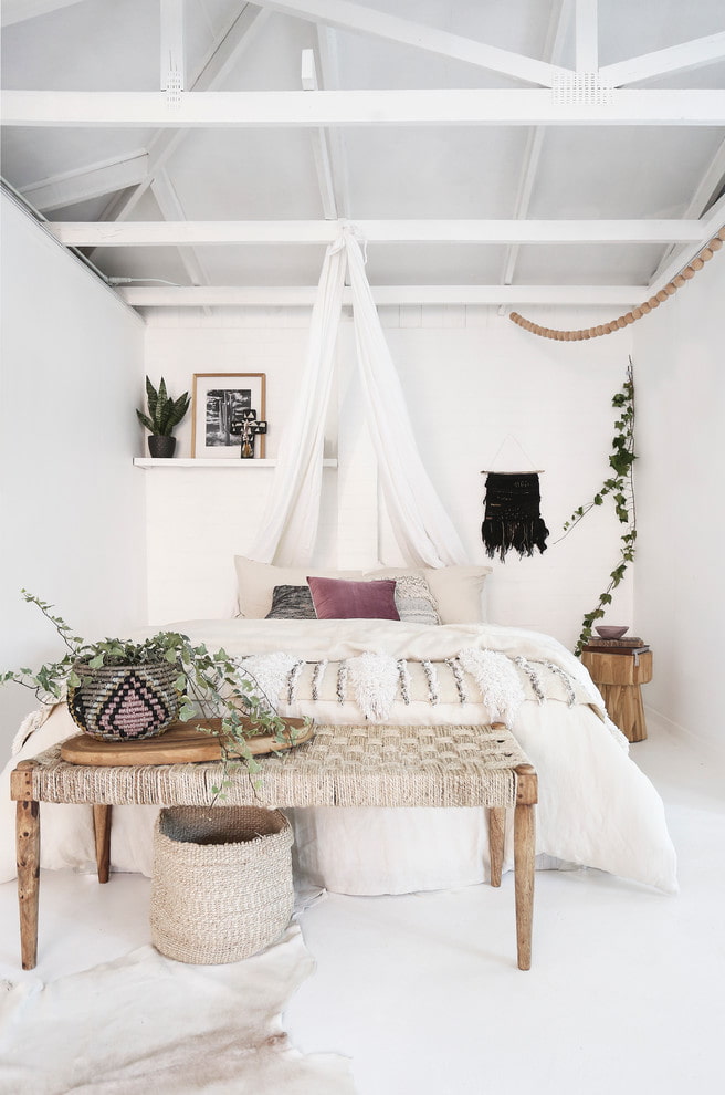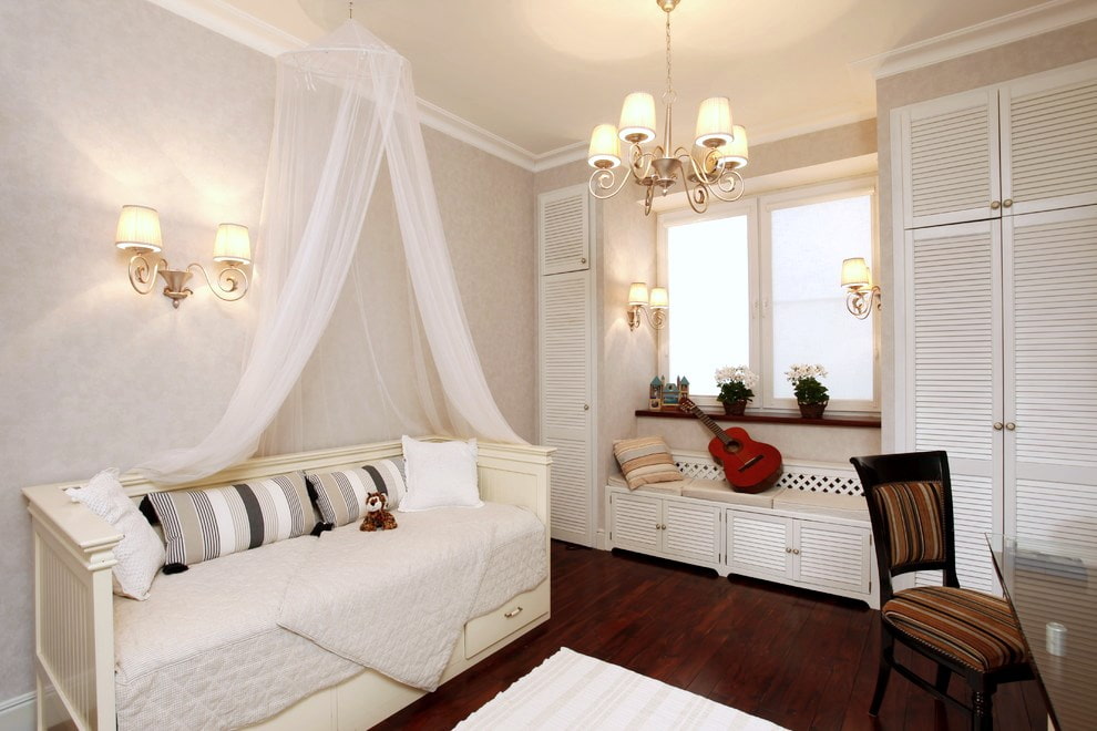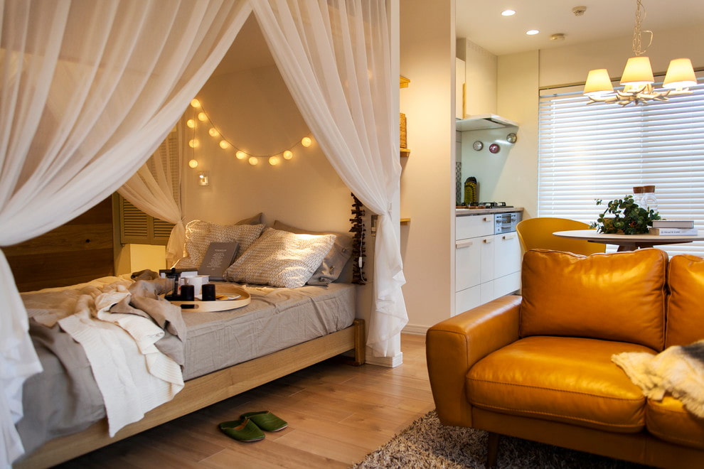 In a small studio or in a room in the country, a canopy will help zone the space. A small niche with a bed will become cozier if you frame it with a light canopy and decorate it with a garland.
