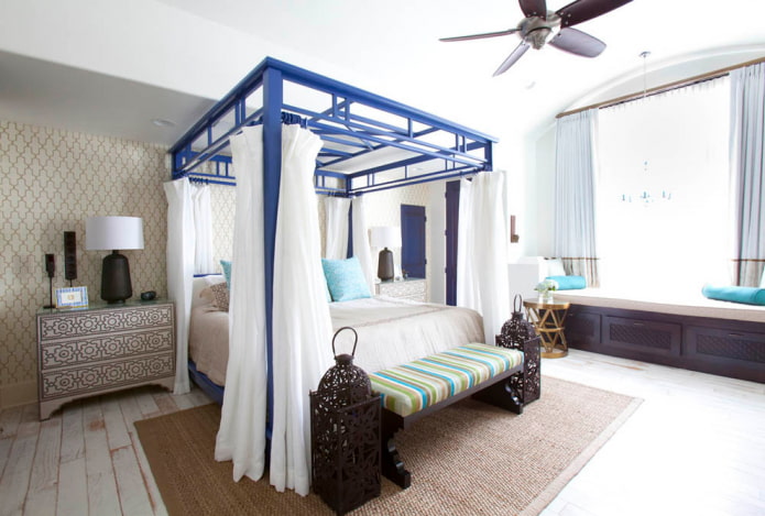 The combination of blue and white shades and natural wood is characteristic of the enchanting nautical style. A light, light canopy will come in handy here, adding airiness to the atmosphere.