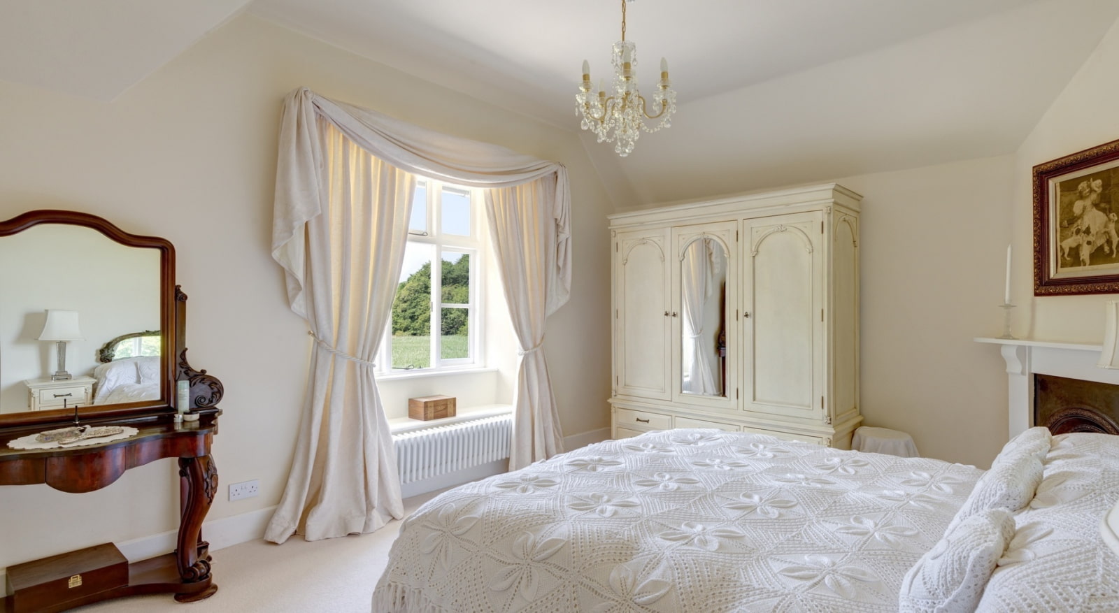 The photo shows the interior of the bedroom with asymmetric lambrequins on the windows.
