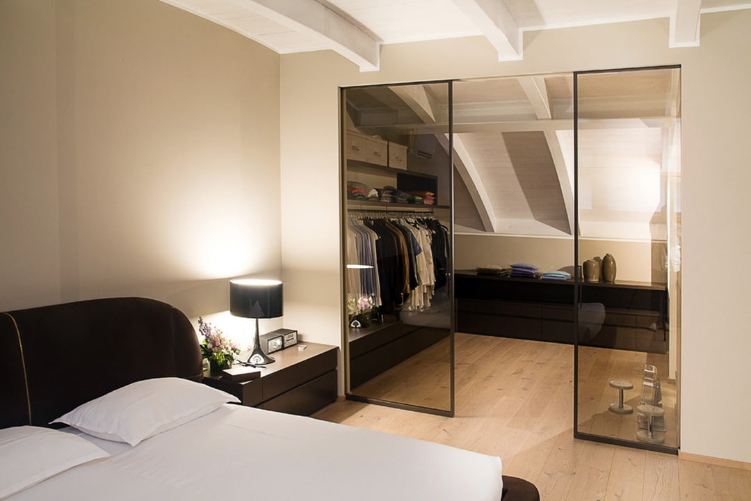 In the photo there is a dressing room with sliding compartment doors in the interior of the attic bedroom.
