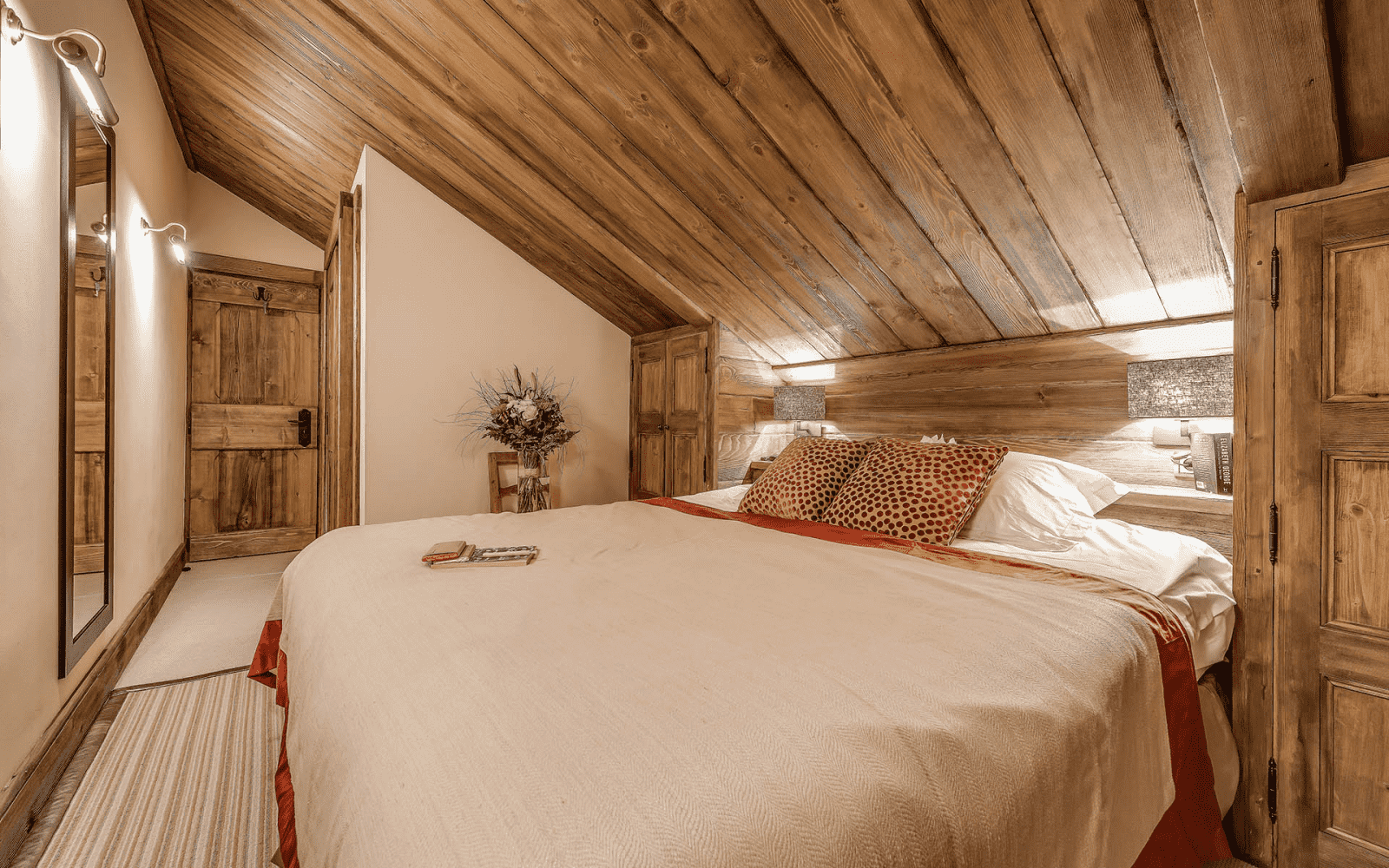 The photo shows the interior of a chalet-style bedroom located in the attic in a wooden house.