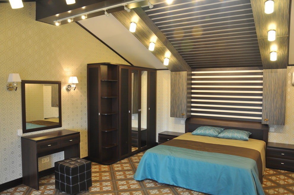 In the photo, the interior of the attic bedroom with lighting, the form of ceiling lamps and bedside lamps.