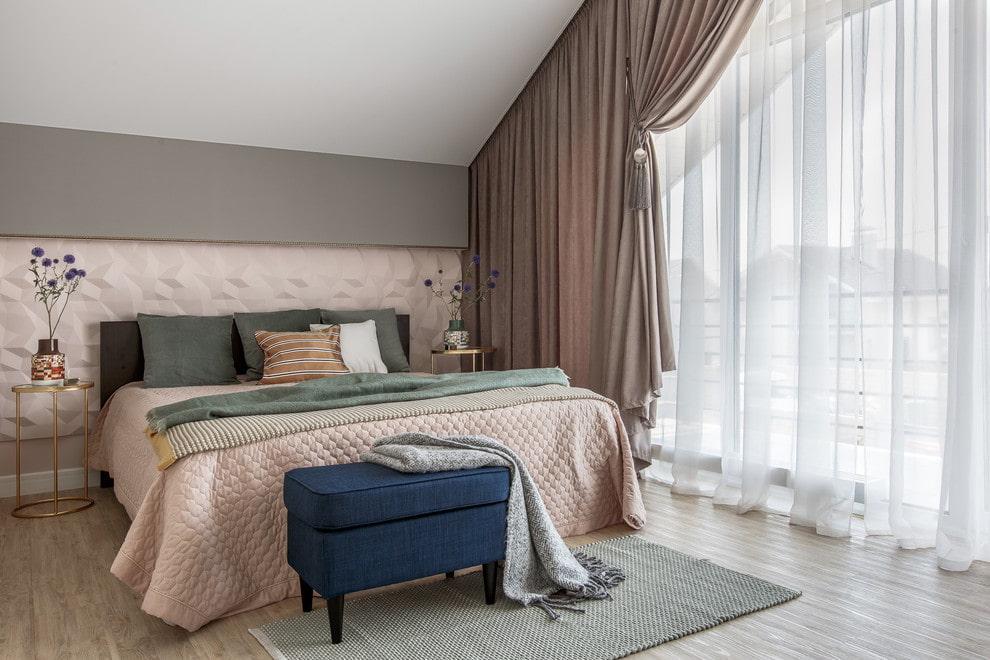 - Curtains and other textiles.Particularly important is the choice of curtains, which can be made from a transparent material that allows light to pass through, or from a denser fabric that helps to shade the room. A fairly common solution for a bedroom is considered to be blinds or day-night curtains that do not let in daylight. For an attic in a light design, bright decor will be appropriate, in the form of pillows, bedspreads, blankets or a small rug located in the middle of the room or near the sleeping bed.