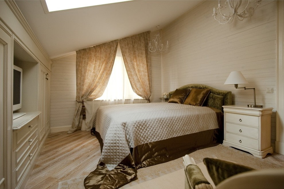 This style is best suited for decorating a bedroom in the attic. Thanks to such a simple and measured design, it turns out to achieve a peaceful atmosphere.
