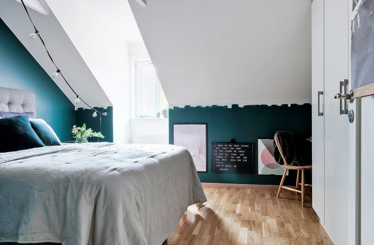 In this room with a sloped ceiling, it is not advisable to use large quantities of red, burgundy, orange and other too bright colors.