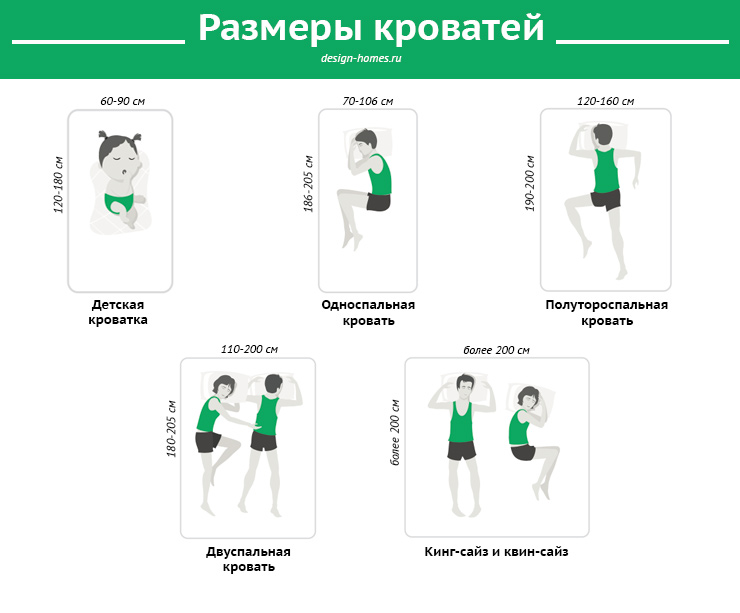 Single beds are designed for children and small adults, one and a half beds - for one teenager or adult, double - for a couple. The width should be comfortable so that the resting person can put his hands behind his head without touching the person lying next to him. The length of the structure should exceed the height of the owner by 10-15 cm. If these parameters are not taken into account, there is a risk of buying a product that causes discomfort during sleep.