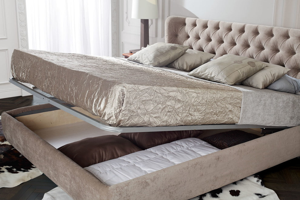 The bed can become a multifunctional piece of furniture if you choose a product with a lifting base and a gas lift. This is especially true for cramped rooms: a storage space arranged under a berth can replace an entire wardrobe.