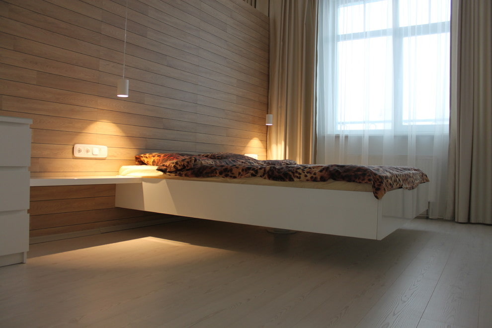 The floating bed itself is laconic, so designers actively use the headboard to translate their original ideas. The most popular decor option is soft tapestry, leather or textile upholstery. The upholstery is made in the form of a carriage tie, decorated with rhinestones, photo printing. The role of the headboard can be played by a wall with soft volumetric panels.