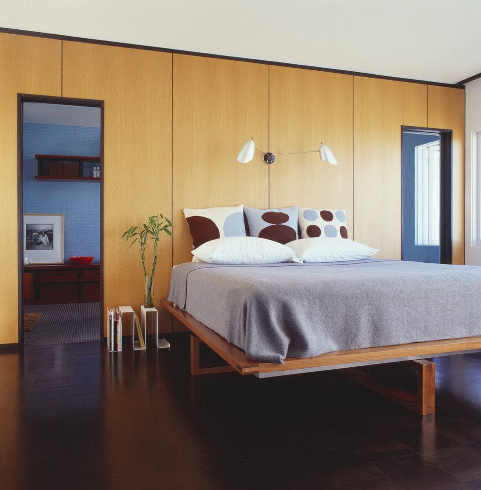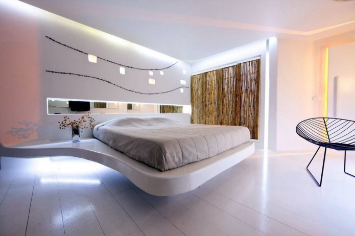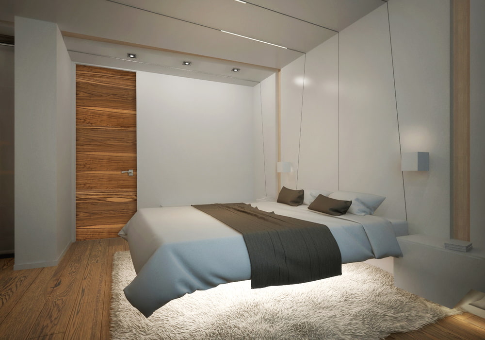 In a separate bedroom, floating furniture will become an interior dominant. The floating effect combined with multi-level lighting creates a relaxing atmosphere in the room.Since floating furniture is large enough, in order to compensate, you can use the space above its headboard for shelving or cabinets.