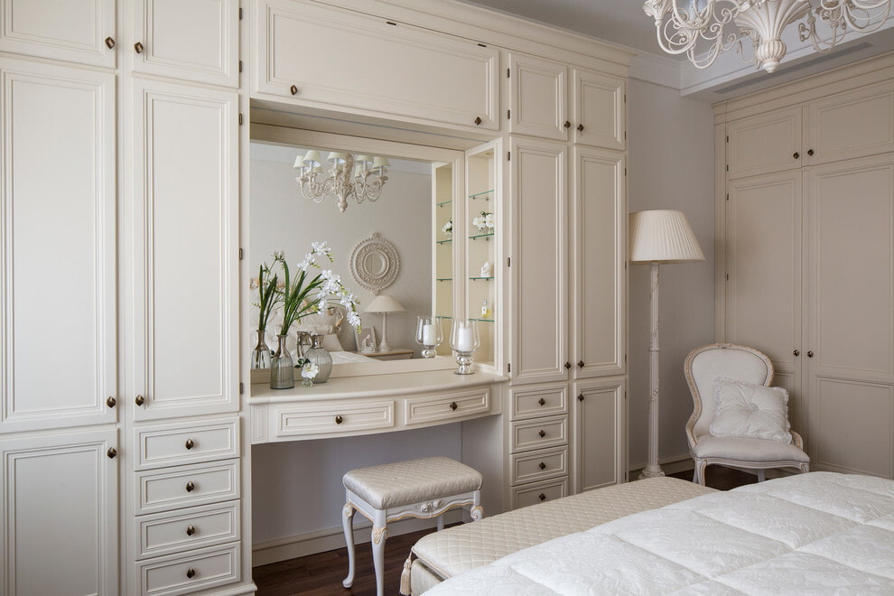 If you have a separate dressing room, then organizing a storage area in the bedroom is not at all necessary. However, more often than not, a wardrobe is an integral part of the interior.