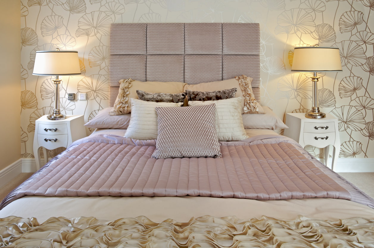 Pillows laid on the bed will add charm to it, decorate and complete the look of a romantic bedroom. It is pleasant to wrap up in a cozy knitted blanket together, warming up the shoulders and legs. Textiles on the bed, including cover, should be in harmony with the curtains.