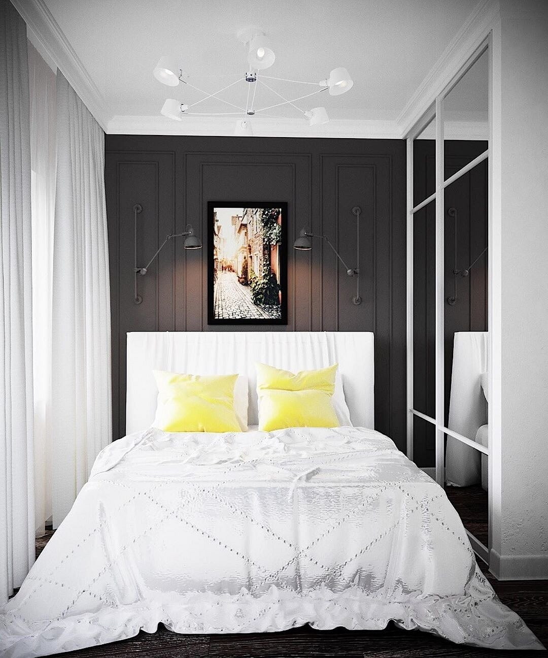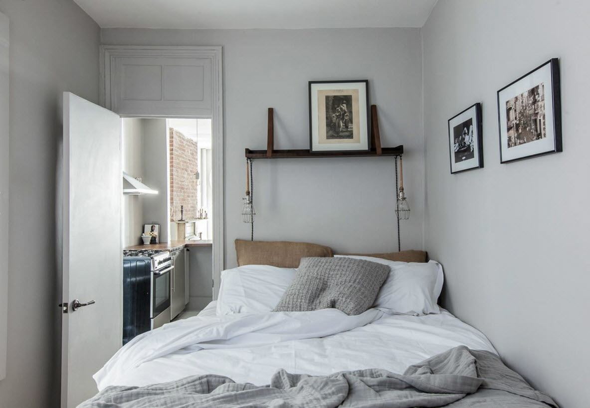 Do you find light colors boring? Dilute it with small bright spots. But it is precisely small - plain flashy curtains or a blanket on the bed will not work. But a catchy print or small drawing on light curtains is what you need. In the design of a small bedroom, use colored pillows, photographs or paintings, lampshades for a variety.