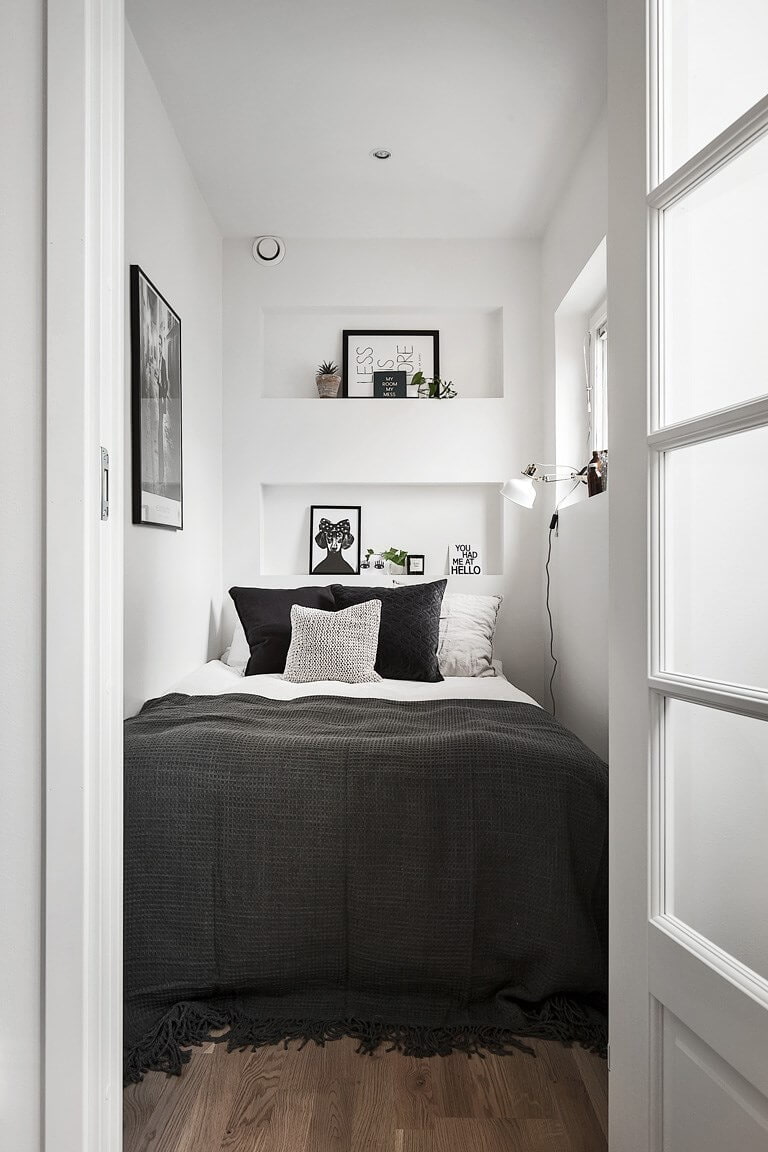 - The bed is sideways to the window. With a bedroom width of 2 meters, the bed is placed sideways to the side farthest from the entrance. Advantage of the method: the entire niche is occupied, there is room at the door for a cabinet or a desktop. Negative: approach to the bed from one side only.