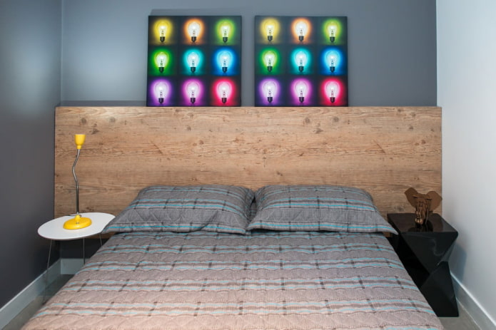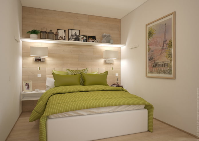 A suitable headboard is either soft wall panels (ideally in the color of the walls or a couple of shades darker), or as airy as possible. In the second case, a white wrought-iron bed is meant. In the layout, when the bed is pushed against the wall, ordinary pillows will play the role of the headboard.