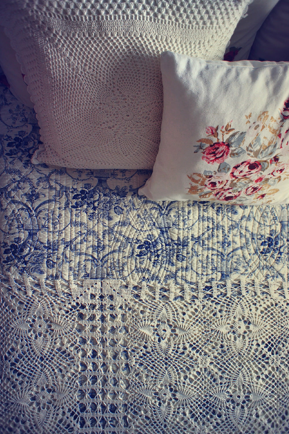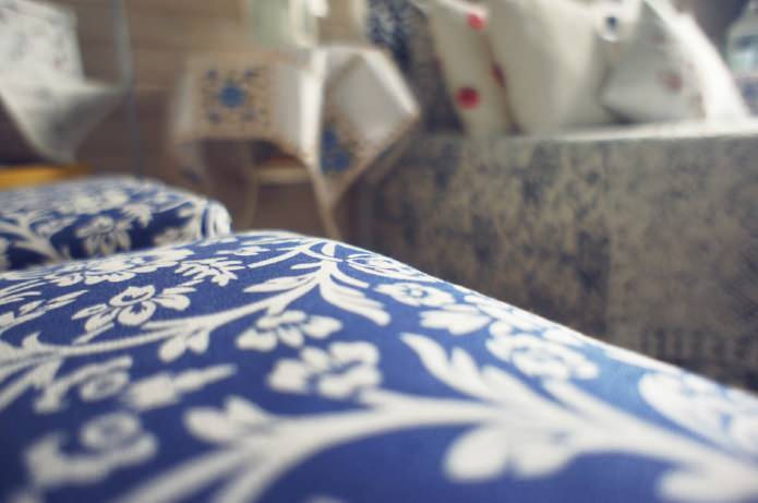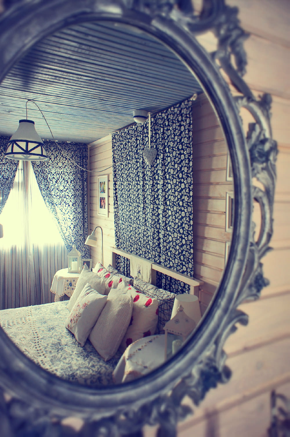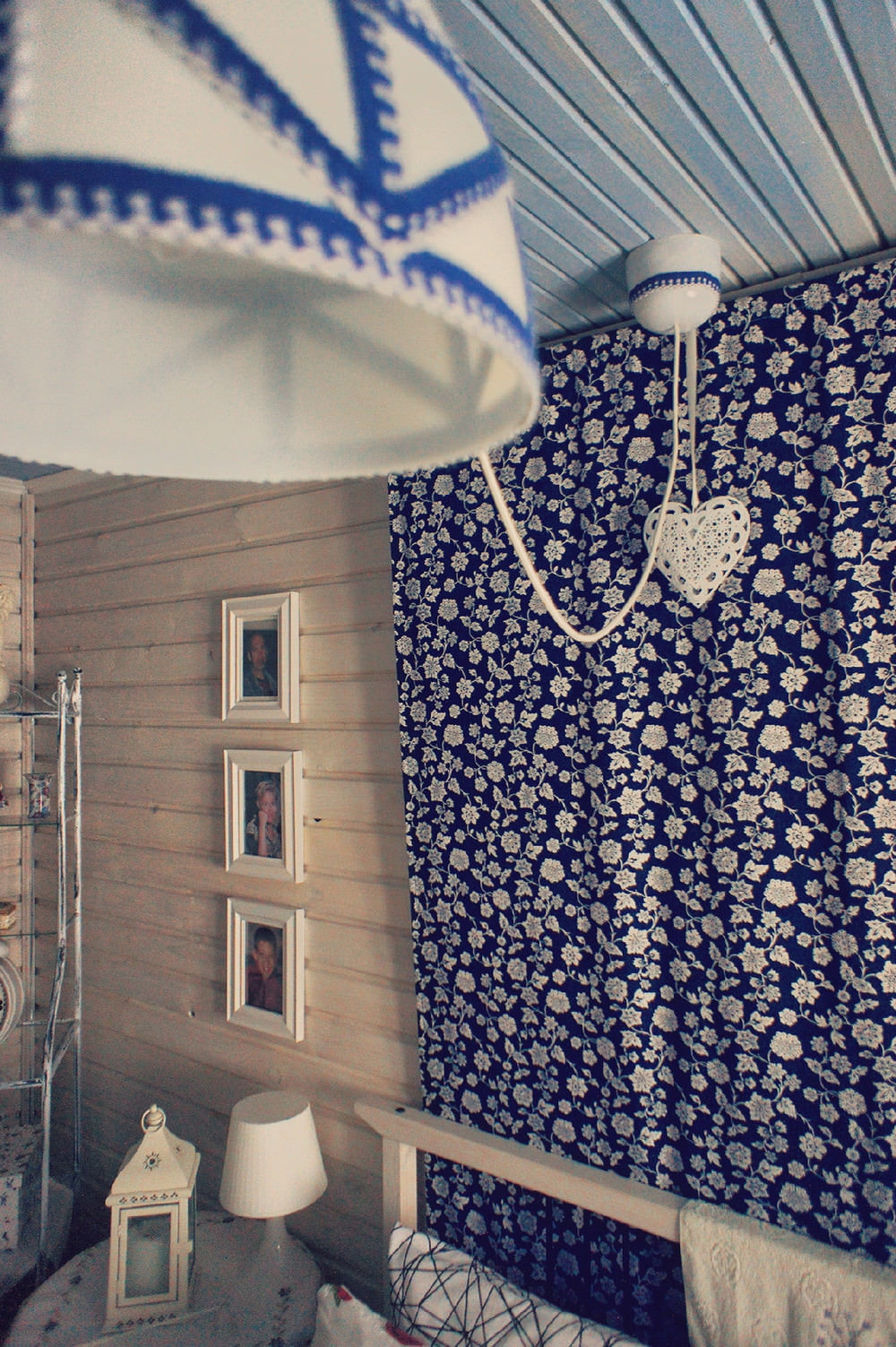 The lace pattern on the blue and white fabric supports the lace on the bed, and adds coziness. The fabric was bought at IKEA, some of the textiles the owners of the bedroom bought while traveling the world - lace on the bed comes from Cuba, and the napkins on the bedside tables are from Prague.