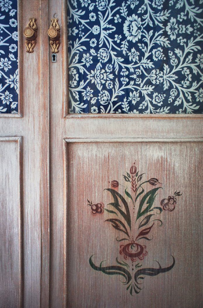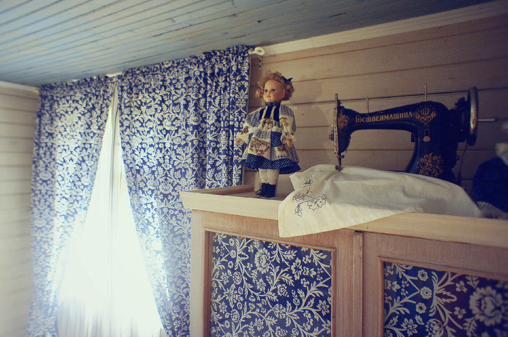 An old wardrobe that has long lost its appearance, which once served in administrative premises, after minor alterations, fit perfectly into country bedroom... The upper panels were replaced with those covered with blue and white fabric, the lower ones were decorated with a pretty stencil pattern. An antique sewing machine, a doll and an embroidered napkin formed a decorative composition on the wardrobe, which gives the interior a cosiness.