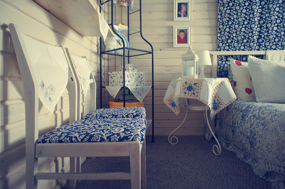 The role of the central chandelier in rustic bedroom makes an inexpensive ikeevsky lamp, on which a blue braid pattern is glued. The wire hangs freely, which allows you to outweigh the chandelier to the desired place on the ceiling by driving in several hooks.