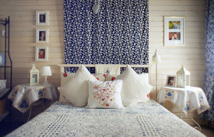 Rustic bedroom looks especially romantic thanks to the unusual bedside headboard. In this case, its role is played by a fabric curtain suspended by a cornice on the wall.