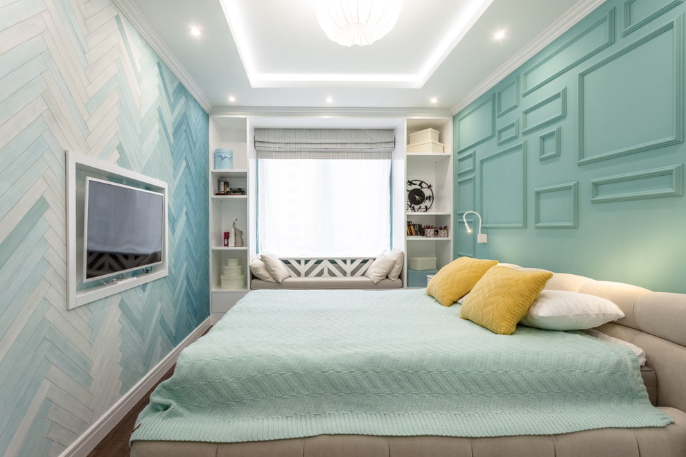 The photo shows the interior of a bedroom in a Khrushchev building with a white ceiling and mint-colored walls.