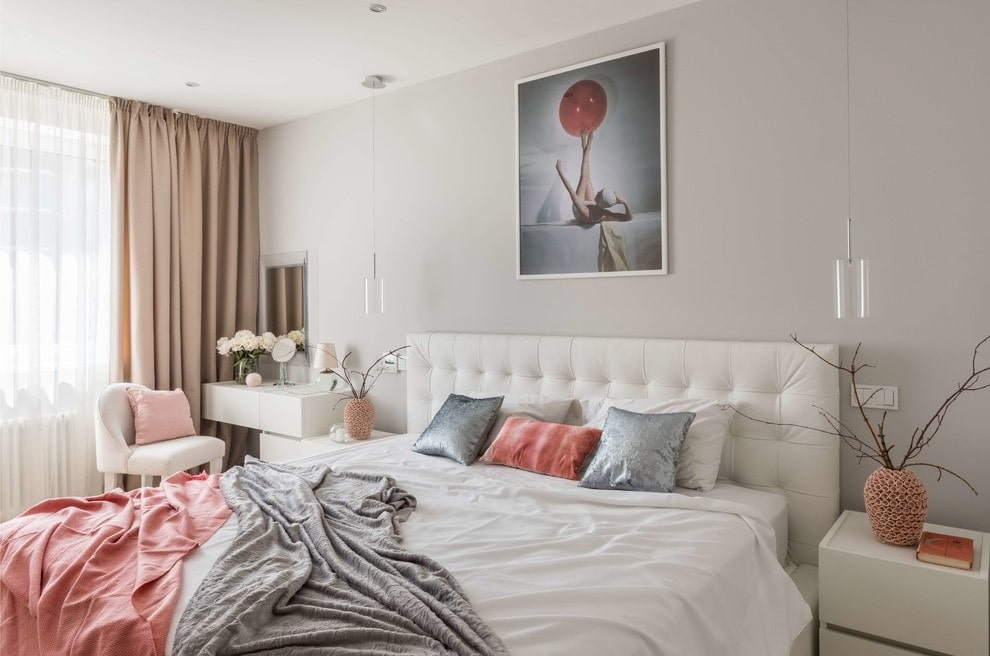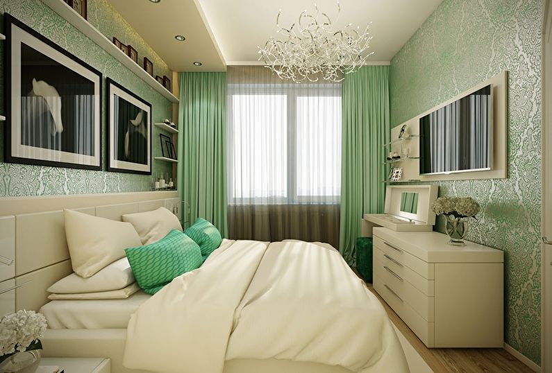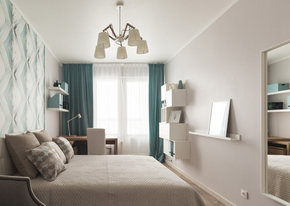 It is better to decorate a small room in neutral and light beige, peach, blue, white, purple, pink or light green colors. Delicate pistachio, mint or lilac colors will be an ideal complement to the interior. Such a color will visually expand the space and form a cozy and pleasant atmosphere in the bedroom in the Khrushchev.